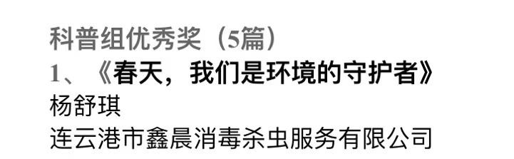 连云港市鑫晨消毒杀虫服务有限公司杨舒琪《春天,我们是环境的守护者》获得2021年“卫康杯”征文赛科普组优秀奖。